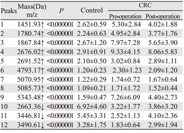 Methods Serum samples of normal control (CRTL, n=72), colorectal cancer (pre-operation CRC, n=72, and post-operation CRC, n=72) were collected from 2014-9-1 to 2016-9-1. Peptidome of all samples were extracted by magnetic-bead-based weak cation-exchange chromatography (MB-WCX) and detected by calibrated Autoflex Ⅲ MALDI-TOF-MS. Peptide mass fingerprinting were analyzed by ClinProtTools 2.0 software, and the differentially-expressioned peptides were further identified using LC-ESI-MS/MS.