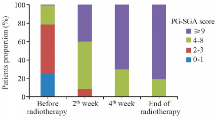 Methods We reviewed retrospectively the clinical data of 140 NPC patients. PG-SGA questionnaire, the anthropometry measurements, hematological indexes, side-effects of chemoradiotherapy and quality of life were used to evaluate nutritional status of NPC patients. Multivariate Logistic regression model was used to analyze the main influence factors for malnutrition of NPC patients.