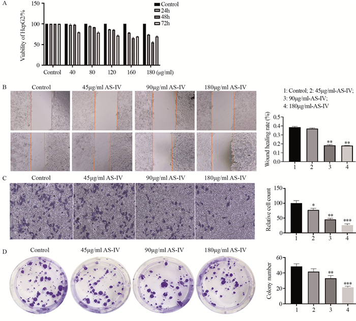 Methods We constructed a "drug-disease" network pharmacological map, analyzed the core genes of astragaloside Ⅳ (AS-Ⅳ) in HCC, screened key signaling pathways, and established a "drug-target" molecular dynamics model. In vitro assay was used to detect migration, proliferation and invasion abilities. Flow cytometry and qRT-PCR were used to detect the effect of AS-Ⅳ on the cell cycle and apoptosis, and the expression of core gene of HepG2.