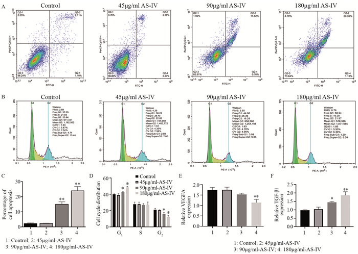 Results The core target of AS-Ⅳ acting on HCC was VEGFA. Compared with the control group, the high concentration of AS-Ⅳ significantly inhibited the migration, invasion and proliferation of HepG2 cells, blocked the metastasis of HepG2 cells from G1 to G2 phase, promoted their apoptosis, down-regulated VEGFA expression and up-regulated TGF-β1 expression.