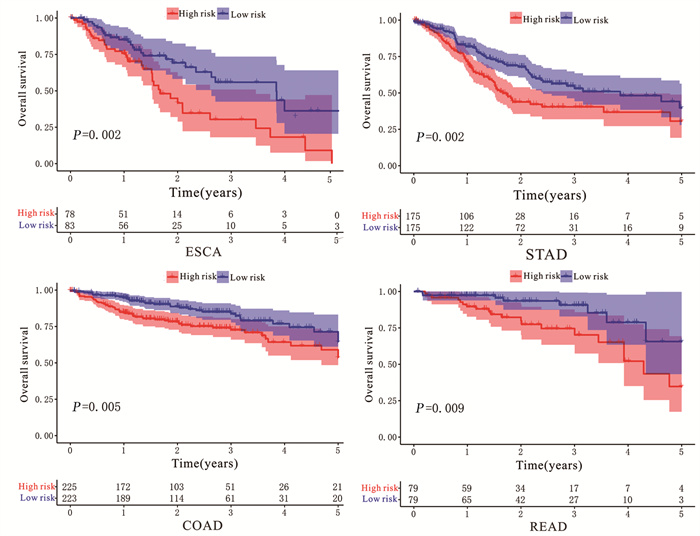 Methods We collected the data of patients with esophageal cancer, gastric cancer, colon cancer and rectal cancer in the TCGA database. Univariate Cox analysis, Lasso and multivariate Cox analysis were performed to construct the prognostic risk scoring model. The model was validated and tested for independence. Time-dependent ROC curve analysis was performed to evaluate the clinical application value of the model.