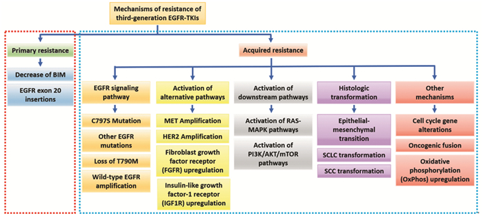 Targeted therapy of epidermal growth factor receptor tyrosine kinase inhibitor (EGFR-TKIs) has been the standard modality as the first-line treatment of advanced EGFR-mutated non-small cell lung cancer (NSCLC). The first- and second-generation EGFR-TKIs have shown significant efficacy in NSCLC patients with EGFR-sensitive mutations and EGFR T790M mutation is the main resistance mechanism of the first- and second-generation EGFR-TKIs. The third-generation EGFR-TKIs, represented by osimertinib, has been approved to overcome the EGFR T790M mutation in patients who are resistant to the first- or second-generation TKIs, which brings more survival benefits for patients with advanced NSCLC. However, the development of acquired drug resistance is inevitable. In this review, we summarize the research progress in resistance mechanisms of advanced NSCLC to the third-generation EGFR-TKIs and the potential overcoming strategies.