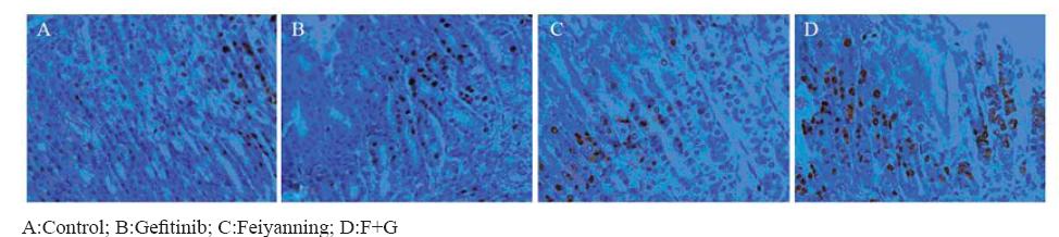 实验结束后处死裸鼠,称瘤重及体重,计算 肿瘤抑制率,各组的抑瘤率为:模型组0;吉非 替尼组21.91%;肺岩宁方组25.11%;联合用药组 53.28%。吉非替尼组和肺岩宁方组瘤重与模型组 相比差异无统计学意义(P >0.05),联合组与单 用吉非替尼和肺岩宁组相比差异有统计学意义(P <0.01),两药合用q值为1.284,提示肺岩宁方与 吉非替尼联合后具有协同增效作用。 2.3 肺岩宁方、吉非替尼及联合用药对肿瘤凋亡的影响