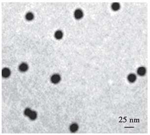 图1 纳米金的电子显微镜图像(×18 000) Figure1 The image of gold nano particles(GNP) observed by electron microscope(×18 000) |