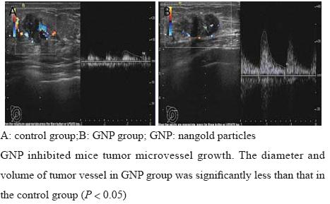图2 超声检测裸鼠肝癌血管分布及血液灌注 Figure2 Diameter and volume of tumor vessel detected by Doppler ultrasound |