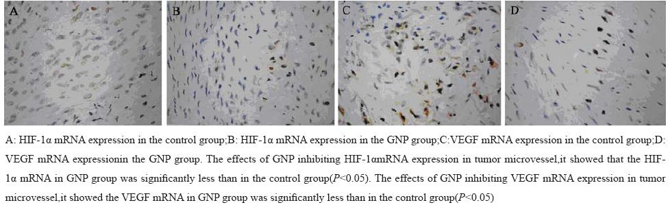 mRNA表达的影响 原位杂交检测裸鼠肝癌组织中HIF-1α mRNA 和VEGF mRNA表达,其结果显示,GNP组中 HIF-1α mRNA(15.3±7.4)和VEGF mRNA (23.7±9.5) 表达较对照组HIF-1α mRNA(67.2±13.1)和VEGF mRNA(70.3±14.6)均有所下降,两者之间差异有统 计学意义(P<0.05),见图3。
