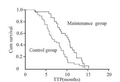 2 结果 2.1 治疗时间和临床疗效随访截止至2012年10月1日,随访时间为3~61 月,中位随访时间为22月,所有病例均有完整 的临床资料及随访资料。在维持治疗组卡培他 滨治疗的中位周期数为4周期(3~9周期)。在 维持治疗组86.7%(26/30)的患者接受了二线化 疗,对照组89.6%(43/48)的接受了二线化疗, P=0.978(连续校正χ2),差异无统计学意义;没有 患者进行靶向治疗。维持治疗组的中位疾病进展 时间(median time to progression,mTTP)为10.3月 (95%CI:9.173~11.427),TTP范围为2.5~16.0月, 对照组的mTTP为6.5月(95% CI:4.803~8.197), TTP范围为2.2~14.3月,两组mTTP对比差异有统 计学意义(P=0.000231),对照组比卡培他滨维持治 疗组mTTP明显要短,见图 1。维持治疗组的中位 总生存期(median overall survival,mOS)为31.4月 (95% CI:24.534~38.266),OS范围为5.2~61月;对 照组的mOS为18.4月(95% CI:16.175~20.625), OS范围为3.5~40月,两组的mOS对比差异有统计 学意义(P=0.000319)对照组比卡培他滨维持治 疗组mOS明显要短,见图 2。