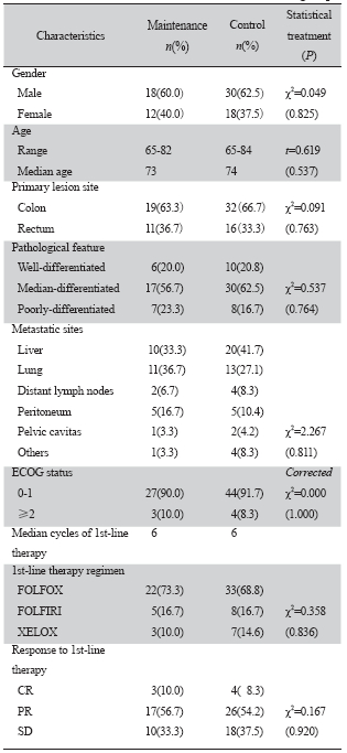 1 资料与方法 1.1 一般资料2007年8月1日—2011年8月1日在辽宁医学院 附属第一医院共有78例不可切除的老年晚期转移 性结直肠癌患者按照标准计量和给药方法接受了 系统一线化疗,化疗方案包括FOLFOX(奥沙利 铂-亚叶酸钙-5氟尿嘧啶)、FOLFIRI(伊立替康- 亚叶酸钙-5氟尿嘧啶)、XELOX(奥沙利铂-卡 培他滨)。达到疾病控制(CR+PR+SD)的患者 根据患者自己的意愿分为卡培他滨维持治疗组30 例和对照组(仅观察)48例,所有患者均签署知 情同意书。两组病例的基线临床特征均具有可比 性,见表1。