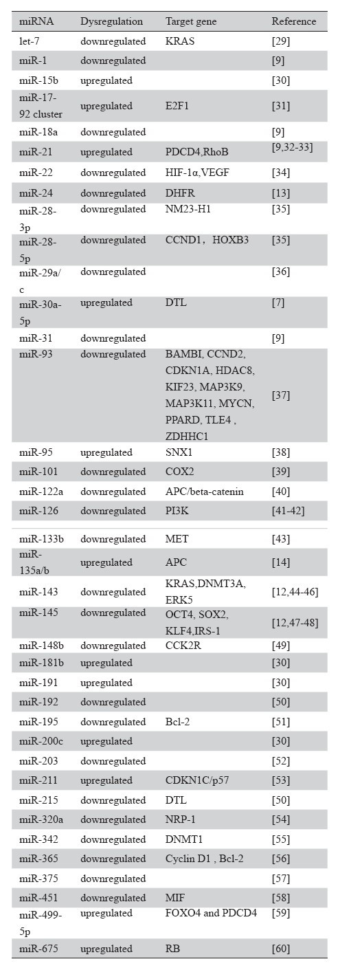 许多文献均指出,结直肠癌组织与正常组织相比,其miRNA表达水平会发生改变[7, 8, 9]。表1中 列出了部分与结直肠癌相关的miRNA及其对应的 靶基因。一些miRNA已经被发现可能具有促进或 抑制结直肠癌的作用。例如,miR-21是一种具有 致癌作用的miRNA,在进展期结肠癌组织中过表 达[8]。另一方面,一些miRNA,例如miR-1、miR- 30a-5p等,已经被证实在结直肠癌中有表达降低的 情况,因而被认为是具有抑癌作用的miRNA[7, 9]。 其他在结直肠癌中比较重要的miRNA还有miR-17– 92簇、miR-24、miR-31、miR-135a/b、miR-143、 miR-145和miR-200c等[10, 11, 12, 13, 14, 15]。