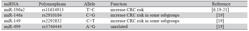 表2 部分miRNA多态性与结直肠癌的关系 Table 2 Relation between miRNA polymorphism and colorectal cancer |