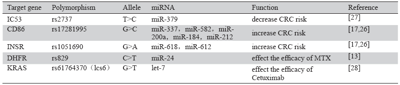 表3 部分miRNA靶基因多态性与结直肠癌的关系 Table 3 Relation between target gene polymorphism and colorectal cancer |