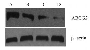 用不含EDTA的 胰酶消化各组细胞至单细胞悬液状态,1 200 r/min 离心5 min弃上清液后,加入PBS清洗再离心,重 复3次,收集细胞每管1×106,按凋亡试剂盒步骤逐 步进行染色后,在FACS Vantage SE流式细胞仪上 进行检测。 1.2.5 Western blot检测ABCG2蛋白的表达