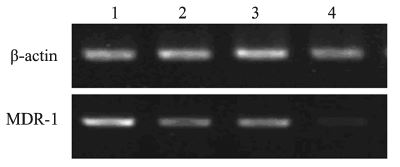 | 1: 5-Fu group; 2: DSED group; 3: control group; 4: DSED +5-Fu grouP</span> 图 2 RT-PCR检测瘤组织内MDR-1及β-actin的表达 Figure 2 Expression of MDR1 and β-actin in all groups detected by RT-PCR |