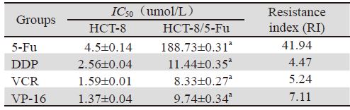 HCT-8/5-Fu细胞株具有多药耐药特性,5-Fu对 耐药细胞的耐药倍数41.94。见表 2。同时该耐药细 胞对结果不同、机制各异的化疗药VCR、DDP和 VP-16均产生不同程度的耐药性。符合肿瘤细胞对 一种化疗药产生耐药性后,对机制不同、结构各 异其他化疗药产生交叉耐药的特性。