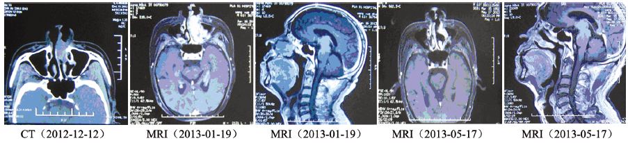 | 图 1 病例2肝细胞癌伴鼻窦转移患者不同时期的CT、MRI图像资料 Figure 1 CT and MRI images of case2 hepatocellular carcinoma with sinus metastasis at different time |