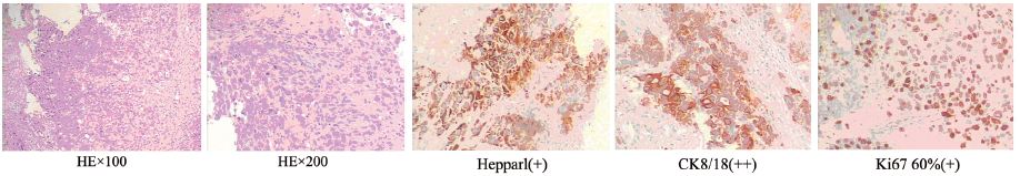 | 图 2 病例2肝细胞癌伴鼻窦转移患者活检病理图片及免疫组织化学图片 Figure 2 Biopsy pathological image and immunohistochemistry image of case2 hepatocellular carcinoma with sinus metastasis |