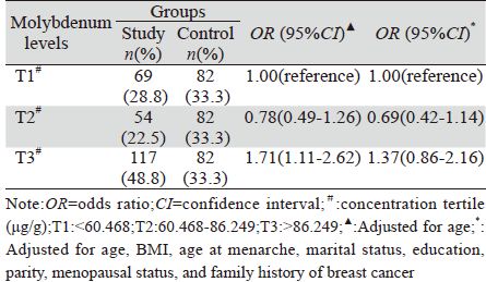 本研究以对照组尿钼水平的三分位值为基准, 将研究人群尿钼浓度划分为三个水平(T1、T2、 T3)。经年龄调整后,与低尿钼水平组(T1)相 比,高尿钼水平组(T3)发生乳腺癌的风险增加 (OR=1.71,95%CI = 1.11~2.62),而中尿钼水平 组(T2)对乳腺癌的发生风险有降低的趋势,但 差异无统计学意义(P=0.312)。经多种已知或潜 在的乳腺癌危险因素调整后,中、高尿钼水平组发 生乳腺癌的风险较低尿钼水平组分别有下降和上 升的趋势,但差异均无统计学意义,见表 1。