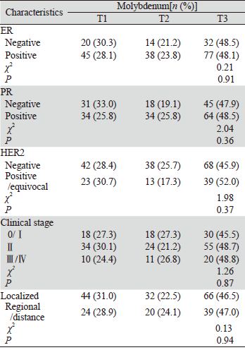 本研究进行了尿钼水平与乳腺癌患者临床病 理特征的关联分析,结果提示尿钼水平与ER、 PR、HER2、临床分级分型无显著关联(P均 >0.05),见表 3。