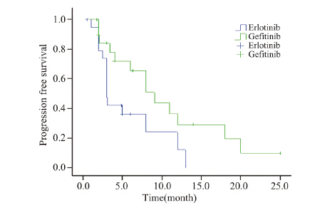 | 图 1 两组患者在初始吉非替尼治疗时期的无进展生存曲线图 Figure 1 Progression free survival curves of two groups after the initial gefitinib therapy |