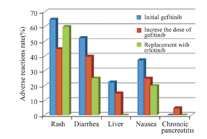 在IDEAL-2研究中,吉非替尼的不良反应发 生率呈剂量相关性,但与治疗有效率无关。本研 究显示,使用吉非替尼加量疗法或换用厄洛替尼 疗法的不良反应发生率略有下降,程度明显减 轻,仅表现为Ⅰ~Ⅱ度的皮疹,轻度的恶心、腹 泻、肝功损害反应,虽有1例患者出现药物相关性 胰腺炎,但症状轻微,不影响治疗方案的实施。 表明两组治疗均有较好的安全性。其机制可能与 吉非替尼获得性耐药后EGFR对TKIs敏感度下降 有关。研究发现初始TKIs耐药的患者在应用化疗 后,再次使用同种TKIs药物仍有部分患者达到临 床获益,但机制并不很明确,有学者认为是因间歇 期化疗使耐药瘤细胞数目减少或重新获得对TKIs敏 感[15]。Hata等[16]报道了125例厄洛替尼治疗吉非替 尼有效的选择标准:PS评分优的,吉非替尼治疗 有效,吉非替尼与厄洛替尼治疗之间经过细胞毒 性治疗的患者。但本研究显示插入化疗未能延长 再次TKIs治疗的PFS,证实化疗不能恢复TKIs的敏 感度,以往研究中插入化疗后再次TKIs获益的患 者可能存在首次TKIs治疗剂量不足的情况。进一 步对预后因素分析显示吉非替尼常规剂量治疗失 败患者的预后与是否经过插入化疗、年龄、PS评 分、性别、组织学分型、吸烟无关,但与是否进 行吉非替尼加量治疗和换用厄洛替尼治疗相关; 多因素分析显示吉非替尼加量疗法较更换厄洛替 尼疗法可能获得更好的预后。