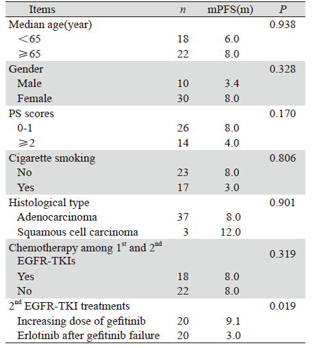 综上所述,初始吉非替尼治疗有效的患者出 现病情进展时,应用吉非替尼加量疗法或更换厄 洛替尼疗法均能使部分患者再次获益,且有较好 的安全性,其中加量疗法在提高患者的PFS方面更 有优势。