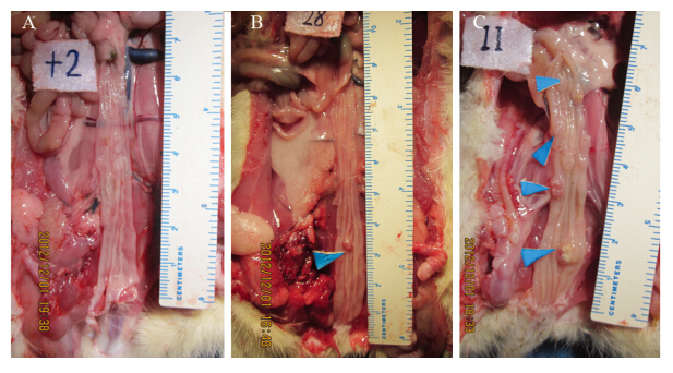 | A: normal colonic mucosa; B: single colonic tumor; C: multiple colonic tumor 图 1 正常结肠黏膜及造模后大肠肿瘤 Figure 1 Normal colonic mucosa and colonic tumor after modeling |