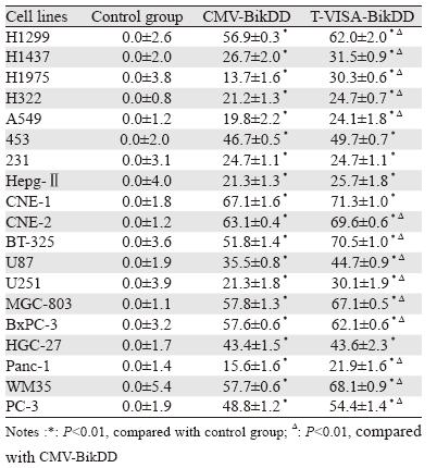 转染质粒48 h后,T-VISA-BikDD和CMVBi kDD质粒组的1 9 种肿瘤细胞的死亡率明显 上升,与空白对照组比较,差异有统计学意义 (P<0.01);与CMV-BikDD质粒组比较,T-VISABikDD 质粒组的肺癌细胞株、胶质瘤细胞株、鼻 咽癌细胞株、黑色素瘤细胞株、胃癌细胞株、胰 腺癌细胞株和前列腺癌细胞株等14个细胞株的死 亡率显著上升(P<0.01),这一结果提示,在促 进肿瘤细胞杀伤作用上,T-VISA-BikDD质粒比 CMV-BikDD质粒具有高效性,结果见表 1。