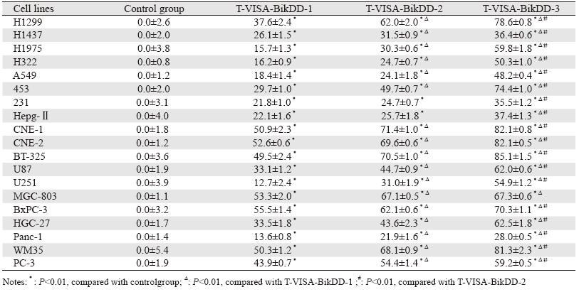 转染质粒48 h后,与空白对照组比较,T-VISABikDD 低、中、高三个剂量组的多种肿瘤细胞的死 亡率均显著上升(P<0.01)。随着T-VISA-BikDD 剂量的增加,细胞的死亡率不断上升,当T-VISABikDD 剂量为2 μg时,肿瘤细胞的死亡率最高。 与T-VISA-BikDD低剂量组比较,T-VISA-BikDD 高剂量组的19种肿瘤细胞的死亡率均显著性上升 (P<0.01);T-VISA-BikDD中剂量组除肝癌细 胞(Hepg-Ⅱ)和乳腺癌细胞(MDA-MB-231) 外,其余17株细胞株的死亡率与T-VISA-BikDD低 剂量组比较,差异均有统计学意义(P<0.01)。 T-VISA-BikDD高剂量组与中剂量组比较,除胃 癌细胞(MGC-803)外,其他18个细胞株的死亡率差异均有统计学意义(P<0.01)。结果显示 T-VISA-BikDD质粒在体外对多种肿瘤细胞株杀伤 作用与剂量存在一定的依赖关系,结果见表 2。
