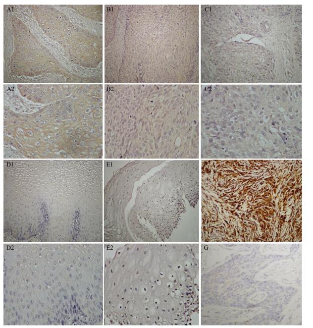 | A1,A2: high expression of B7-H3 in ESCC tissues; B1,B2: moderate expression of B7-H3 in ESCC tissues; C1,C2: low expression of B7-H3 in ESCC tissues; D1,D2: negative expression of B7-H3 in adjacent tissues; E1,E2: negative expression of B7-H3 in atypical hyperplasia tissues ( A1-E1: ×200; A2-E2: ×400); F: positive control of B7-H3 in melanoma cancer( ×200); G: negative control of B7-H3 ( ×200); ESCC: esophageal squamous cell carcinoma 图 1 食管癌组织、癌旁组织及食管鳞状上皮不典型组织中B7-H3的表达(DAB) Figure 1 B7-H3 expression in ESCC tissues,adjacent tissues and esophageal squamous atypical hyperplasia tissues(DAB ) |