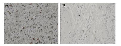 | A: severe infiltration; B: mild infiltration 图 2 食管癌组织中浸润的CD8+T细胞(DAB ×400) Figure 2 Infiltrated CD8+T cells in ESCC tissues(DAB ×400) |