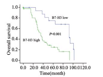 Kaplan-Meier生存分析结果显示,B7-H3阳性 表达的患者,其预后与B7-H3阴性表达的患者有显 著差异,B7-H3高表达者总体生存率明显低于低表 达者(P=0.001),见图 3。