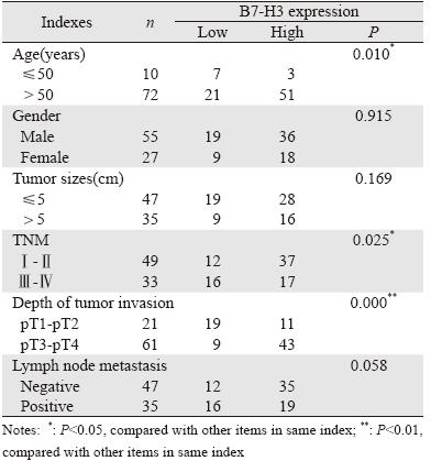 由两位病理科主任医师进行独立阅片。B7-H3 染色结果评估:光学显微镜下每张切片选中肿瘤 细胞较多的5个高倍视野,每个视野计数100个细 胞。以在细胞质或细胞膜上有棕黄色颗粒视为阳 性细胞,结合染色强度和阳性细胞百分比评分如 下:<10%肿瘤细胞着色为阴性“-”;10%~30% 肿瘤细胞着色为“+”;≥30%~60%肿瘤细胞着色 为“++”;>60%肿瘤细胞着色为“+++”。为了便于 分析,将评分为“-”和“+”定为低表达组,“++”和 “+++”定为高表达组。CD8+T淋巴细胞浸润程度的 评估:根据CD8+T淋巴细胞在肿瘤中的分布情况, 划分为4个等级:0为无浸润;1为局部少量浸润; 2为适度浸润;3为大量浸润。其中0和l归为轻度浸 润组,2和3归为高度浸润组。 1.4 统计学方法