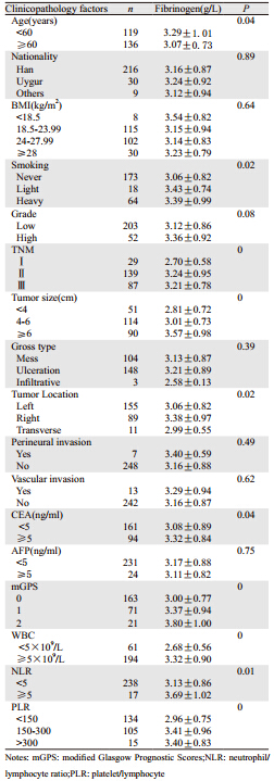 2 结果 2.1 结肠癌术前纤维蛋白原与临床病理特征单因素分析结果255例结肠癌患者的术前平均纤维蛋白原为 (3.17±0.88)g/L,年龄、吸烟、肿瘤大小、肿 瘤位置、TNM分期、格拉斯哥预后评分(modify glasgow prognostic score,mGPS)、白细胞计 数、中性粒细胞计数/淋巴细胞计数(neutrophil/ lymphocyte ratio,NLR)、血小板计数/淋巴细胞 计数(platelet/lymphocyte ratio,PLR)及CEA均 与纤维蛋白原具有相关性,差异具有统计学意义 (P<0.05);而民族、肿瘤分级、BMI、肿瘤大体 类型、神经/淋巴管浸润、AFP均与纤维蛋白原无 相关性(P>0.05),详见表 1。