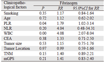 以上提示了纤维蛋白原最终影响了恶性肿瘤 患者的预后,正如Polterauer等[2]得出血浆纤维蛋 白原表达量与5年无进展生存期及5年总生存期均 密切相关(P<0.05),治疗前血清纤维蛋白量为 宫颈癌术后的独立影响因素,此研究团队同年对 卵巢癌同样术前行血清纤维蛋白量检测,并进行 生存分析,得出同样结论[3]。然而,影响预后的纤 维蛋白原与其他临床病理特征是否存在着联系, 也同样受到重点关注,有部分研究证实了治疗前 纤维蛋白原与不同恶性肿瘤的临床病理特征密切 相关。如Takeuchi等[24]研究显示纤维蛋白原与肿 瘤浸润深度、肿瘤大小、白细胞数、血小板数都 有相关性,同时高水平的纤维蛋白原量与淋巴结 转移、远处转移有关,而Ghezzi等[4]研究还显示了 纤维蛋白原与年龄、BMI具有相关性。在本研究 中,纳入的临床病理因素更多,结肠癌患者的术 前纤维蛋白原与肿瘤大小、TNM分期、mGPS评 分、白细胞计数、NLR、及CEA均有相关性,与 以上研究结论基本一致,本研究还发现白细胞计 数和PLR为影响纤维蛋白原的独立危险因素。此 外,在纤维蛋白原、吸烟与死亡率的关系研究[25] 中,显示了吸烟患者的纤维蛋白原水平高于非吸 烟患者。我们对于吸烟因素的分析也显示了两者 的相关性,但具体机制尚需进一步研究。
