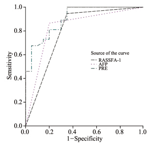 | 图 5 逐步Logistic回归曲线联合肝细胞癌患者AFP和RASSFA-1概率预测的曲线下面积 Figure 5 AUC of predicted probability of stepwise Logistic regression curve combined with RASSFA-1 and AFP in HCC patients |
