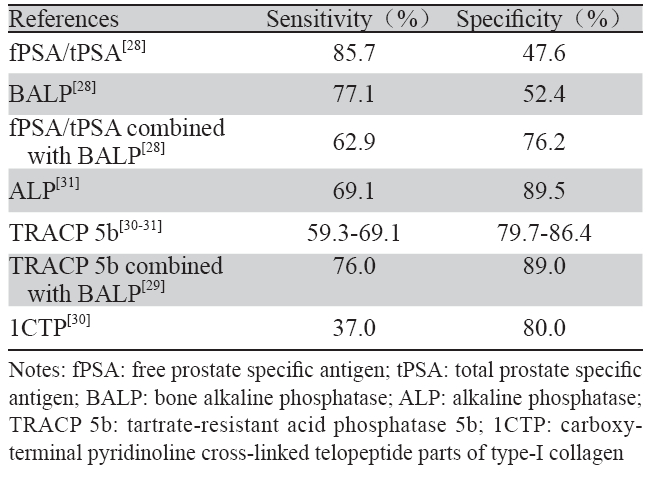 血清学指标与核素骨显像检查比较,有特异 性高、无放射性、便于随访的特点。近年来,国 内外一些研究,采用多种血清学指标联合Gleason 评分、临床T分期等临床特征,建立多因素回归 模型[5, 17, 18]预测骨转移的发生。Tanaka等[18]用上述 预测模型筛查前列腺癌患者,筛选出骨转移危险 度低的患者不进行骨扫描也是安全的,这样可以 减少患者进行骨显像的次数。血清指标如PSA、 fPSA/tPSA、ALP、BALP、TRACP 5b和1CTP都 能确切地帮助早期诊断前列腺癌的骨转移。前列 腺癌患者血清标志物的敏感度、特异性,见表2。 上述指标又各自具有不同的特点,联合应用能互相弥补不足,未来可以加入多因素回归预测模型令 预测结果更准确。其他血清指标如OPG、β-CTX 、 TGF-β1和血清差异性相关蛋白质也与前列腺癌骨 转移有很好的相关性与应用前景,但相关研究报 道不多,它们的价值有待更大样本量的研究来进 一步判断。