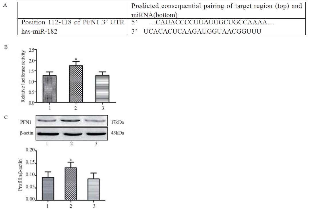 图 3荧光素酶报告基因系统检测miR-182的靶基因及PFN 蛋白表达的检测 Figure 3The target gene of miR-182 and the expression of PFN1 protein were tested luciferase reporter gene system A: the putative miR-182 target site within the PFN1 3’-UTR was depicted; B: the statistical result of relative luciferase activity; C: Western blot depicted PFN1 protein expression in each group of 95-D cell,*P<0.05 versus untransfected group;1:untransfected;2:miR-182 inhibitor;3:negative control |