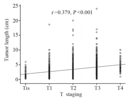 对15 941例肿瘤浸润深度和16 096例淋巴结 转移记录明确的患者分析发现:Tis至T4期肿瘤 最长径中位值及均值随着浸润程度加深依次增长 (χ2 =2615.561,P<0.001),见表2。Spearman相 关性分析的结果显示,随着浸润程度加深,最长 径有逐渐增大的趋势,食管癌肿瘤最长径与浸润 程度(T)显著正相关(r=0.379,P<0.001),见 图1。