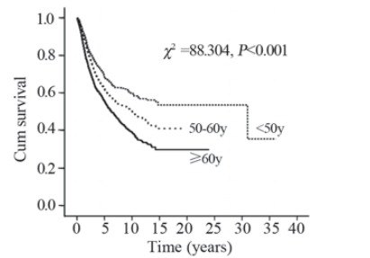 女性患者生存期明显优于男性患者 (χ2 =37.2,P<0.001),见图5。年龄越大,患 者的预后越差,<50岁食管癌患者生存期明显 优于50~60岁患者和≥60岁患者,≥60岁患者生 存期最差(χ2 =88.3,P<0.001),见图6。中晚 期肿瘤大体类型中蕈伞型患者生存期明显优于 其他三种类型,缩窄型生存期最差(χ2 =46.3,P<0.001)。食管中段癌患者生存期明显优于上 段和下段患者,上段患者生存期最差(χ2 =12.9, P=0.002)。高、中分化患者生存期明显优于低 分化患者(χ2 =44.5,P<0.001)。随着浸润程度 (T)加深患者生存期依次明显降低(χ2 =237.1,P<0.001),淋巴结转移阳性患者生存期明显差于 转移阴性患者(χ2 =448.2,P<0.001)。早期食管 癌患者生存期明显优于中晚期患者(χ2 =493.4,P<0.001)。