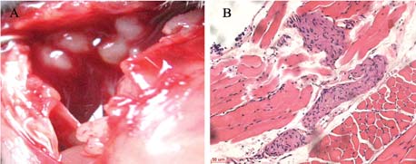 图 1 Lewi's lung cancer cell(LLC)注入C57BL/6J小鼠 胸膜腔后8天肉眼观(A)及镜下组织学形态(B) Figure 1Histological changes of pleural cavity by naked eyes(A) and of partial pleural under microscope(B) after LLC cell was injected for 8 days A:the Lewi's lung cancer cells suspension(1×106/L) was injected into C57BL/6J mice’s right pleural cavity for 8 days,bloody pleural fl uid was observed and there was round white visible tumor growth on partial pleura; B: We could observe the growth and infi ltration of tumor cell in partial pleura(HE staining 20×10) |
