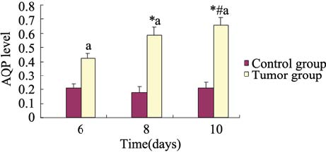 AQP1表达于胸膜壁层间皮细胞,经免疫组 织化学染色并测定平均灰度值,胸膜恶性肿瘤组 小鼠壁层胸膜AQP1表达较对照组明显增强,见 图 2。对照组小鼠的AQP1平均灰度在6、8、10 天分别为(0.20±0.03)、(0.17±0.04)、(0.20 ±0.04),组间差异无统计学意义(P>0.08)。胸 膜恶性肿瘤组小鼠AQP1平均灰度在6、8、10天 分别为(0.42±0.03)、(0.58±0.05)、(0.65± 0.05),各组差异有统计学意义(P=0.03)。胸膜 恶性肿瘤组小鼠AQP1水平较相应天数的对照组小 鼠高,差别有统计学意义(P<0.02),见图 2、3。