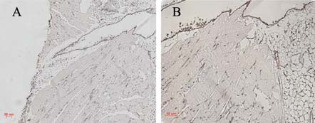 图 3 壁层胸膜的免疫组织化学染色结果( ×40) Figure 3Immunohistochemistry staining of partial pleura (×40) A:control group; B:T10 group |