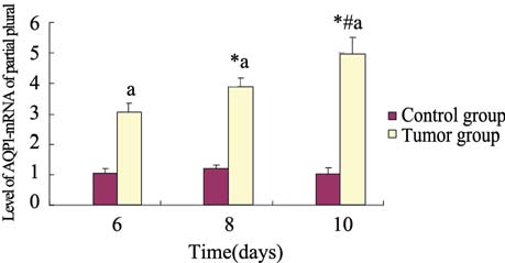 AQP1基因与管家基因的PCR标准曲线斜率 接近,经检验其相关系数r=0.970,两种基因扩 增效率一致。对照组小鼠AQP1-mRNA的相对 值在6、8、10天分别为(1.05±0.12)、(1.19±0.12)、(1.02±0.18),组间差异无统计学 意义(P=0.06)。胸膜恶性肿瘤组小鼠AQP1- mRNA的相对值在6、8、10天分别为3.04±0.27、 3.87±0.28、4.95±0.54,各组差异有统计学意义 (P=0.01)。胸膜恶性肿瘤组小鼠AQP1-mRNA的 相对值较相应天数的对照组小鼠高,差别有统计 学意义(P=0.04),见图 4。