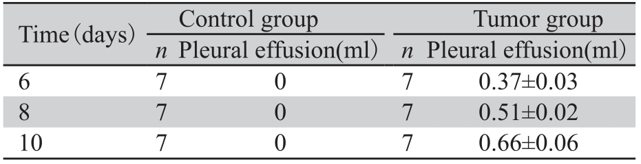 2 结果 2.1 各组小鼠情况各对照组小鼠无死亡,解剖胸腔发现内壁光 滑,未发现胸腔积液;胸膜恶性肿瘤组21只鼠无 死亡,均可见血性胸腔积液,位于右侧胸膜腔, 其中17只可见白色肿瘤结节,见图 1A。壁层胸膜石蜡切片的HE染色可见肿瘤细胞侵袭壁层胸膜, 癌细胞排列紧密,间质结缔组织少,新生毛细血 管丰富,见图 1B。解剖胸腔可见右侧胸膜腔存在 血性胸腔积液,随着肿瘤在胸膜腔内种植时间的 延长,胸水量从6天时的(0.37±0.03)ml增加到10 天时的(0.66±0.06)ml (P=0.04),见表1。