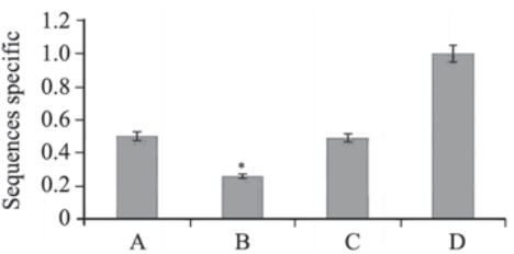![]() | 图 2 Foxp1 siRNA靶序列筛选结果(RT-QPCR)Figure 2 Screening of siRNA Foxp1 target sequences (RTQPCR)A:Foxp1-2516-siRNA; B: Foxp1-823-siRNA; C:Foxp1-1015-siRNA; D:lipo; *: Foxp1-823-siRNA compared with Foxp1-1015-siRNA and Foxp1-2516-siRNA respectively,P<0.05 |
