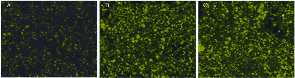 ![]() | 图 3 Lenti-pLL3.7-Foxp1-siRNA感染7721细胞后荧光显微镜下检测结果Figure 3 The result of infecting 7721 cells with lenti-pLL3.7-Foxp1-siRNA observed by fluorescence microcopyA:24 h;B:48 h;C:72 h |