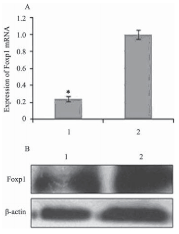 Foxp1基因位于染色体3p14.1,而3号染色体短 臂(3p)的杂合性缺失是很多恶性肿瘤常见的基 因事件[14,15]提示Foxp1可能是一个肿瘤抑制基因。 但又有许多肿瘤中Foxp1的过表达造成患者预后不 佳,如不同类型的淋巴瘤等,提示Foxp1可能具有 某种癌基因的作用[16]。Datta等[17]研究表明:Foxp1 是microRNA-1(miR-1)基因的作用靶点之一;在 人原发性肝癌中miR-1的表达显著下调,使其靶向 抑制Foxp1的能力下降,导致Foxp1过表达,并与 癌恶性生物学行为有关。当miR-1的表达水平升高 时,通过诱导细胞凋亡和抑制细胞周期进程可以 使肝癌细胞的生长受到明显抑制,而此时Foxp1的 表达是减少的。因此,作者推断Foxp1可能参与了 肝癌的发生。