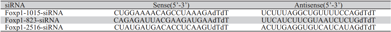 表 1 靶向Foxp1基因823、1 105和2 516碱基位的siRNA序列 Table 1 siRNA sequences of targeted Foxp1-823, 1 015 and 2 516 |