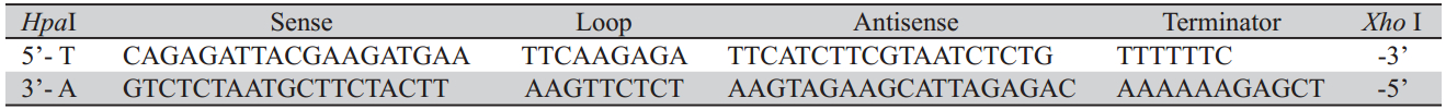 设计分别靶向Foxp1基因823、1 015和2 516碱 基位的三对siRNA序列,见表 1。进行序列比对 (BLAST),确定与人类其他基因组没有同源 性,并注意了G/C的百分比为50%以上,避免选取 高G含量或连续G区段。三条siRNA序列均由百奥 迈科生物技术有限公司协助合成。将高表达Foxp1 的癌细胞接种于24孔培养板中进行培养,当细胞 生长融合达到80%时参照Lipofectamine 2000转染 试剂操作说明将上述三对siRNA靶序列分别转染培 养细胞。转染后48 h提取总RNA,RT-QPCR检测 Foxp1 mRNA表达水平,GAPDH (Glycoraldelyde-3-phosphate dehydrogenase)为内参。反应条件同 上。筛选较高抑制能力的siRNA序列用于构建靶向 Foxp1的siRNA慢病毒载体。