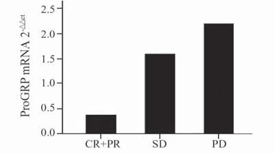 化疗是SCLC首选的治疗方法,监测化疗过程 中外周血CTC的动态变化,可反映肿瘤对化疗药 物敏感度,是目前评估化疗敏感度的重要方法。 目前众多研究[1, 2, 9, 10]提示动态监测CTCs水平变化有 助于早期评估患者化疗疗效,对患者生存期有较 好的预测作用。本研究结果显示,化疗前后患者 ProGRP mRNA水平变化与疗效相关,化疗有效时 水平下降,无效或进展时不变或升高,化疗前后 患者ProGRP mRNA水平变化与化疗后影像学的应 答存在明显相关性,可作为预测肿瘤患者化疗效 果的指标。因此,定期检测并监测ProGRP mRNA 的变化,可及时判断治疗效果,提早发现疾病进 展,为个体化治疗方案选择提供依据。但治疗前 或治疗后CTCs水平较高的患者,延长治疗时间 是否有意义,值得进一步研究。血清ProGRP水 平检测,无论是治疗前水平对病情的评估,还是 治疗前后的水平变化与疗效的关系,均与ProGRP mRNA的结果一致,该指标检测简便易行,是否 能作为CTCs检测的间接指标,需要大样本的临床 观察证实。本组病例数偏少,随访时间尚短,关 于ProGRP mRNA作为CTCs的标志对SCLC患者疗 效评价和预后预测的价值尚需大规模、多中心的 随访研究进行验证。